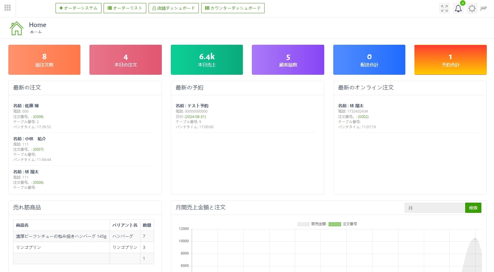 ダッシュボードは、最新の注文・予約状況、売れ筋商品、月間売り上げ金額と注文数、保留中の商品を一目で確認でき、迅速な対応と効率的なサービス提供をサポートします。